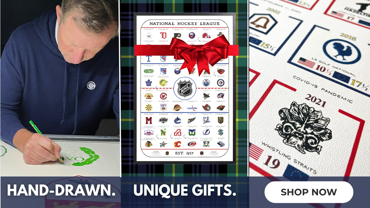 Chandler wanted to have pieces of artwork on his office walls which would connect him with other people. What he envisioned didn’t exist, so he used a drawing ability he had developed in high school to create it. In the fall of 2018, Chandler took his passion for the history of championship golf and creates original hand drawn pieces to celebrate our game’s storied history.