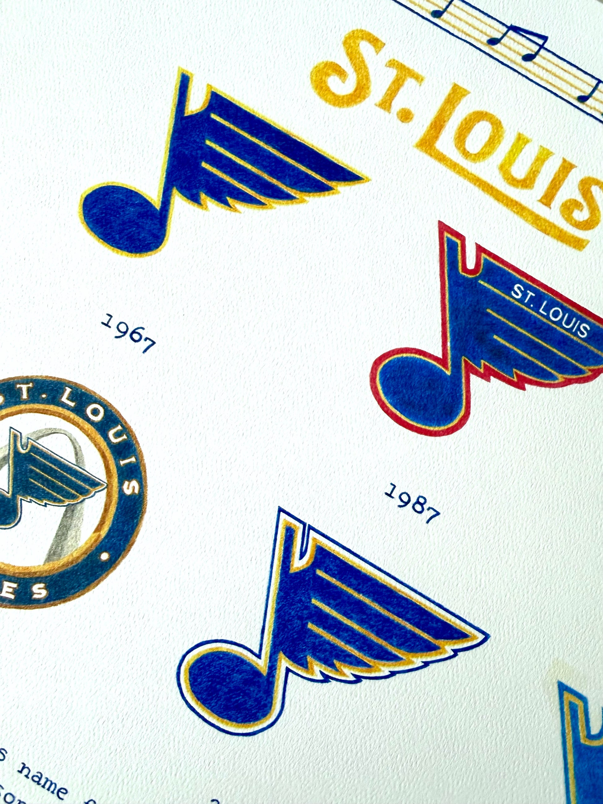 Introducing our first series of team pieces for the NHL – The Logo Evolution of the St. Louis Blues shows how the team logo has evolved since the team’s inception. Along with 6 hand drawn logos, the piece also tells the story of how the team got their name and when the team logo came to be.